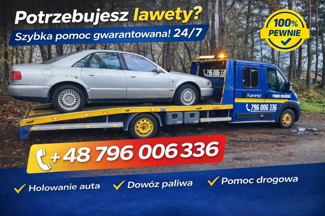 KamHol Pomoc Drogowa 24h 🚨 Świadczymy całodobową pomoc drogową 24h/7 !! Działamy szybko, sprawnie i punktualnie, oferując konkurencyjne ceny oraz pełne wsparcie w nagłych sytuacjach na drodze. Zakres usług: 🚗 Holowanie powypadkowe i awaryjne (rozliczenie z OC sprawcy lub gotówka) 🏍️ Transport samochodów osobowych, dostawczych i motocykli 🚚 Przewóz towarów oraz transporty planowane 🔧 Wymiana koła na drodze ⛽ Dowóz paliwa 🔋 Odpalanie pojazdów 🅿️ Parking strzeżony 24h Dojedziemy szybko na miejsce i zajmiemy się wszystkim, abyś mógł bez stresu wrócić na trasę. Obsługujemy klientów indywidualnych oraz firmy. 📞 Zadzwoń – pomoc drogowa dostępna 24 godziny na dobę!